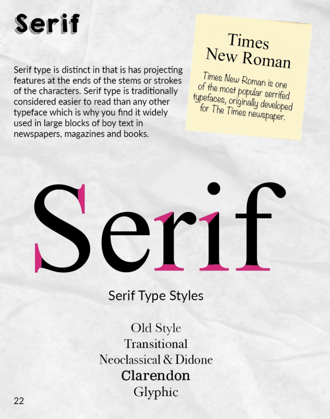 - Classifying Type – Without going into too much detail here I will show examples of single letterforms to a selection of typefaces. I will also talk and show examples of font pairings