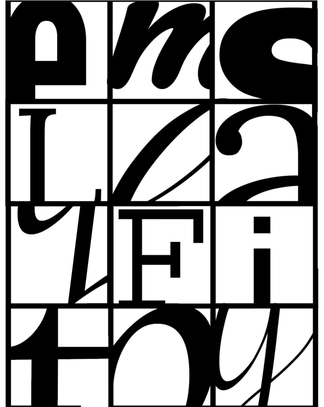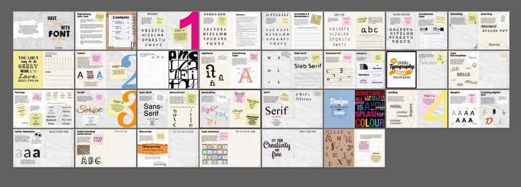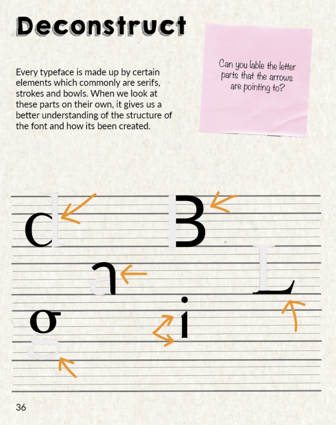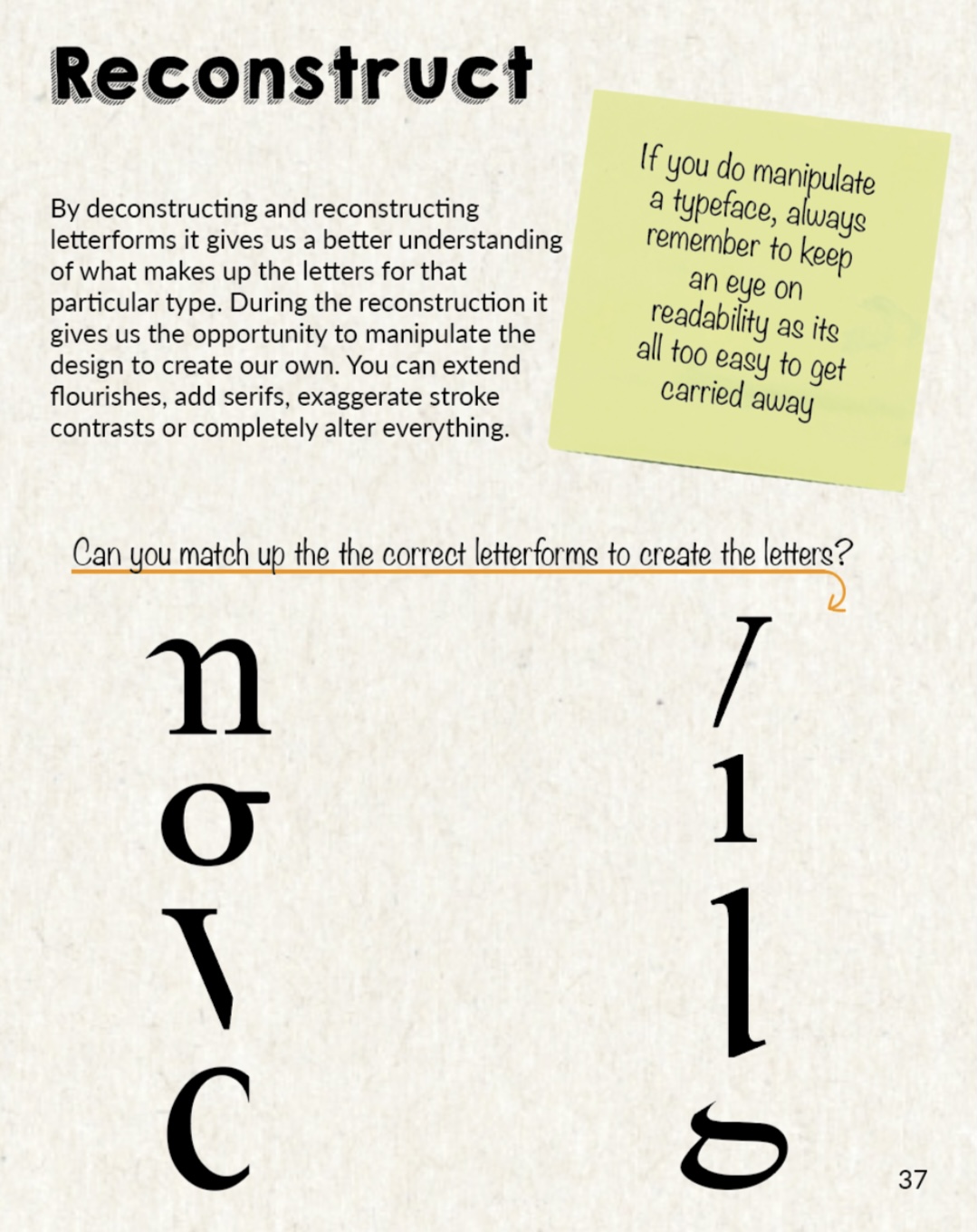 The deconstruction/reconstruction has reminded me of an exercise in part 4 of Core Concepts. We were asked to complete a typographic jigsaw puzzle. I really enjoyed this and it really helped me understand how the letters of the typeface ‘Baskerville’ are constructed. This could be something I could include on one of my DIY pages to help the reader understand more this topic, just like I did.