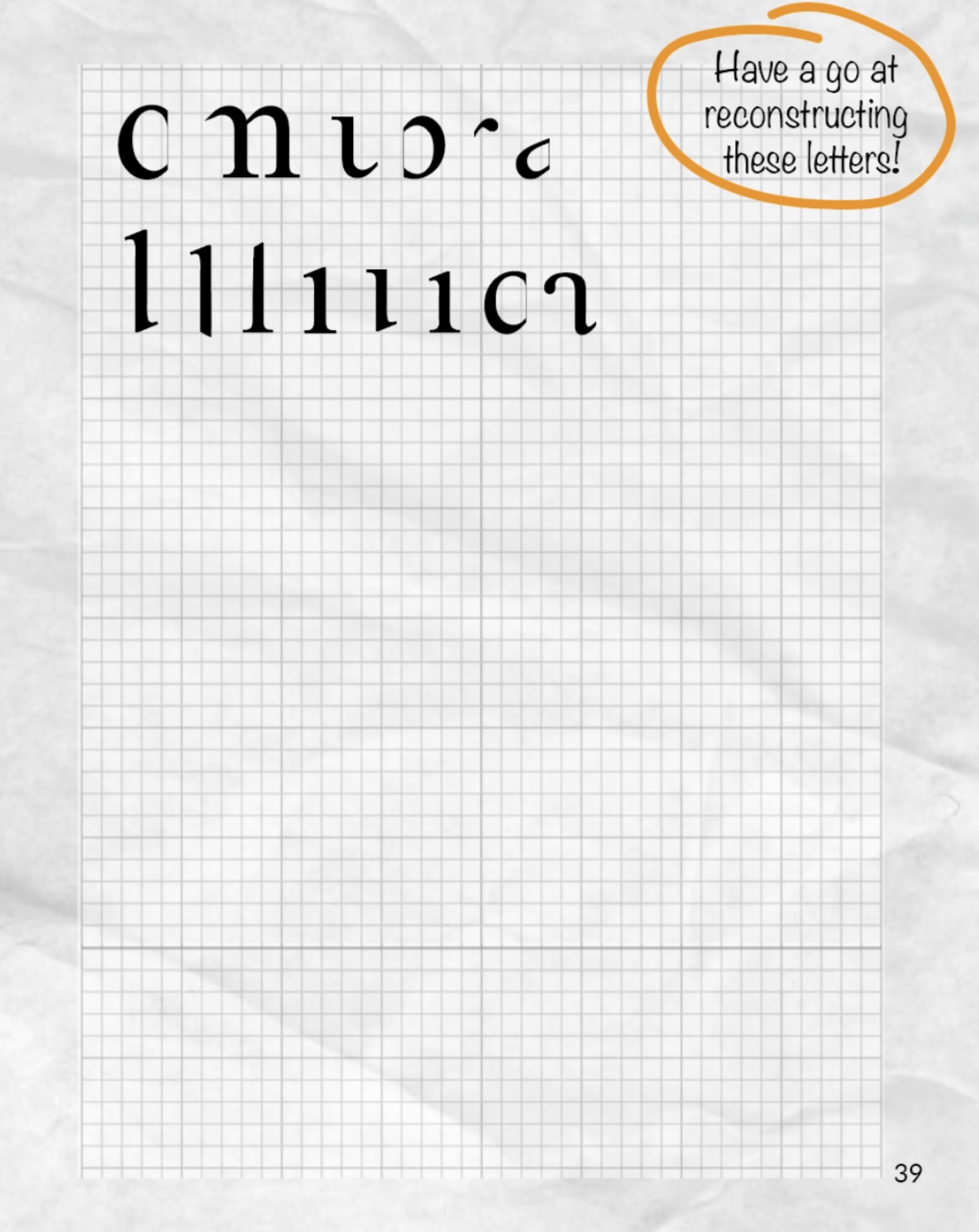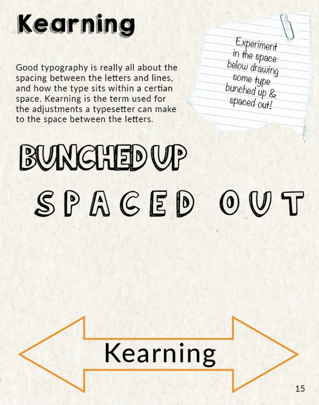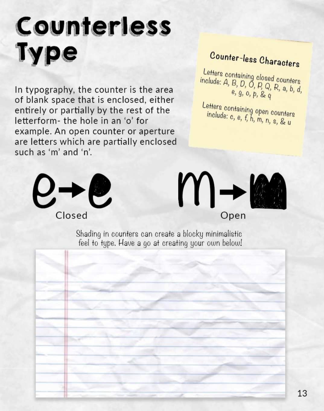 The deconstruction/reconstruction has reminded me of an exercise in part 4 of Core Concepts. We were asked to complete a typographic jigsaw puzzle. I really enjoyed this and it really helped me understand how the letters of the typeface ‘Baskerville’ are constructed. This could be something I could include on one of my DIY pages to help the reader understand more this topic, just like I did.