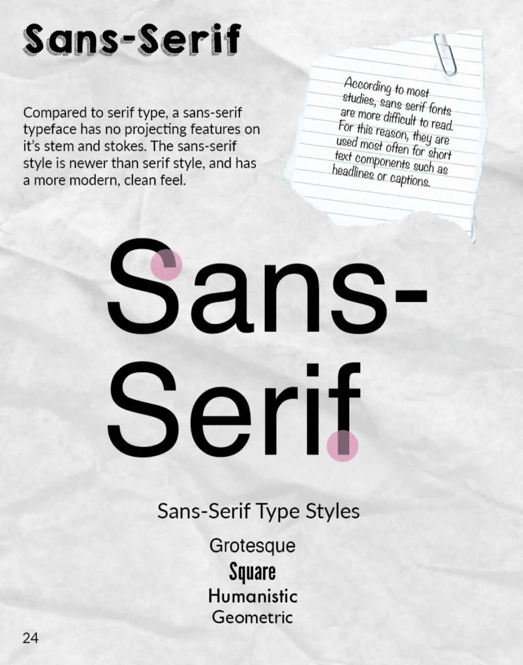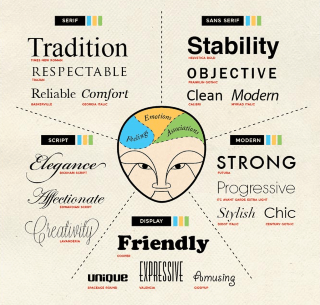 Font personalities – A font can convey mood, attitude, and tone with a personality perceived from the font’s features. Serif are seen as traditional, stable, practical, serious, mature & formal. Slab Serif are more modern, bold, masculine, harsh & assertive. Sans Serif are contemporary, and sometimes sleek and elegant. Script ranges from casual to formal, sleek, elegant & sophisticated. Display typefaces have the most diverse and outspoken personalities.