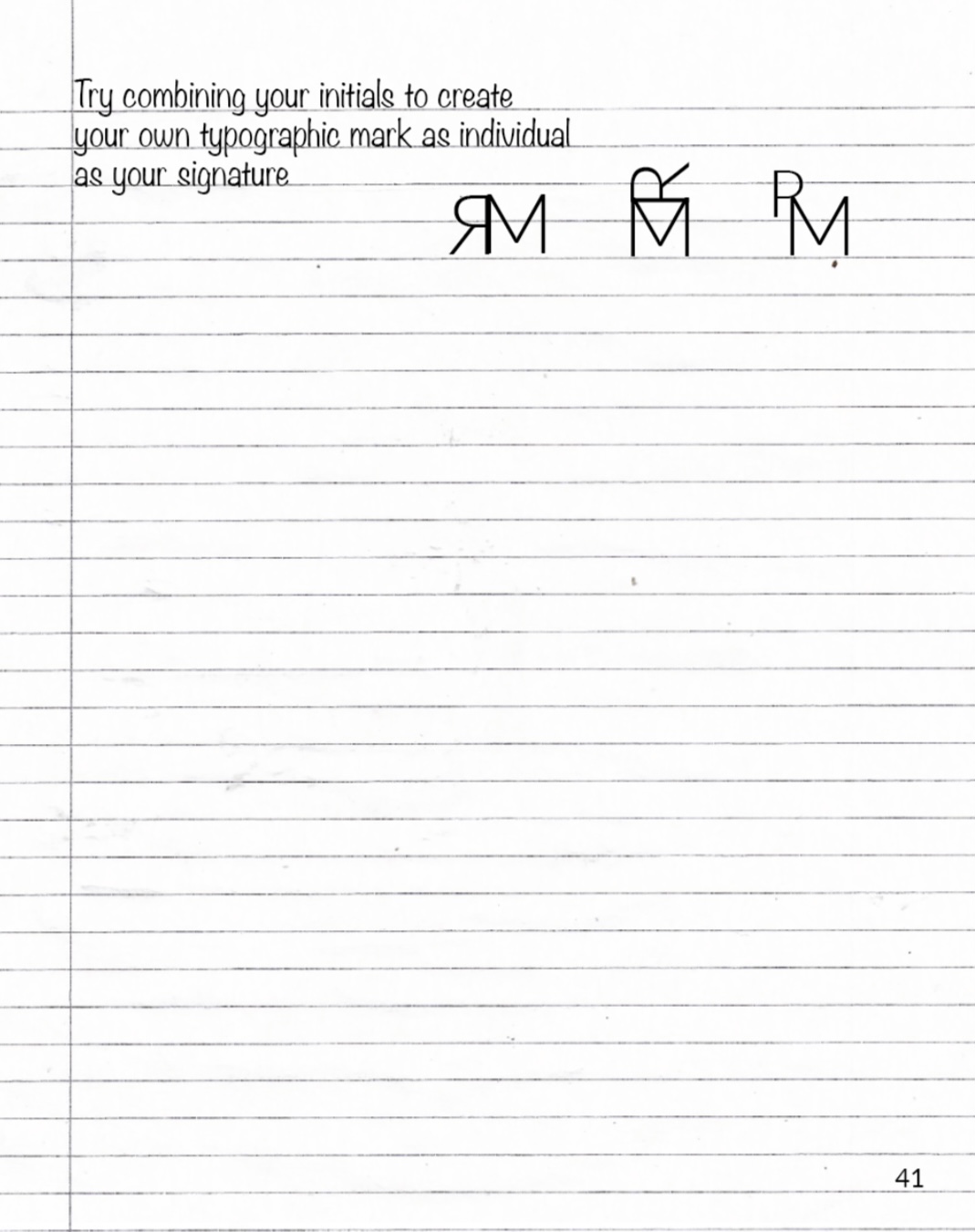 The theme of my book is an easy going DIY style book focusing on building up the readers confidence to create their own typeface, I wanted it to be fun and informative rather than overwhelmingly full of text, and feel that I have achieved just that. I also taught myself things along the way such as creating my own typefaces, I felt by doing this I would be able to give truthful advise and helpful tips. As you may have noticed I took inspiration in my book from my zine created in Assignment 1, I loved the cut and paste look and felt it was very fitting with the style of book created. (Plus I really enjoy the process of getting hands on and creating elements along with drawn imagery used within the book!)