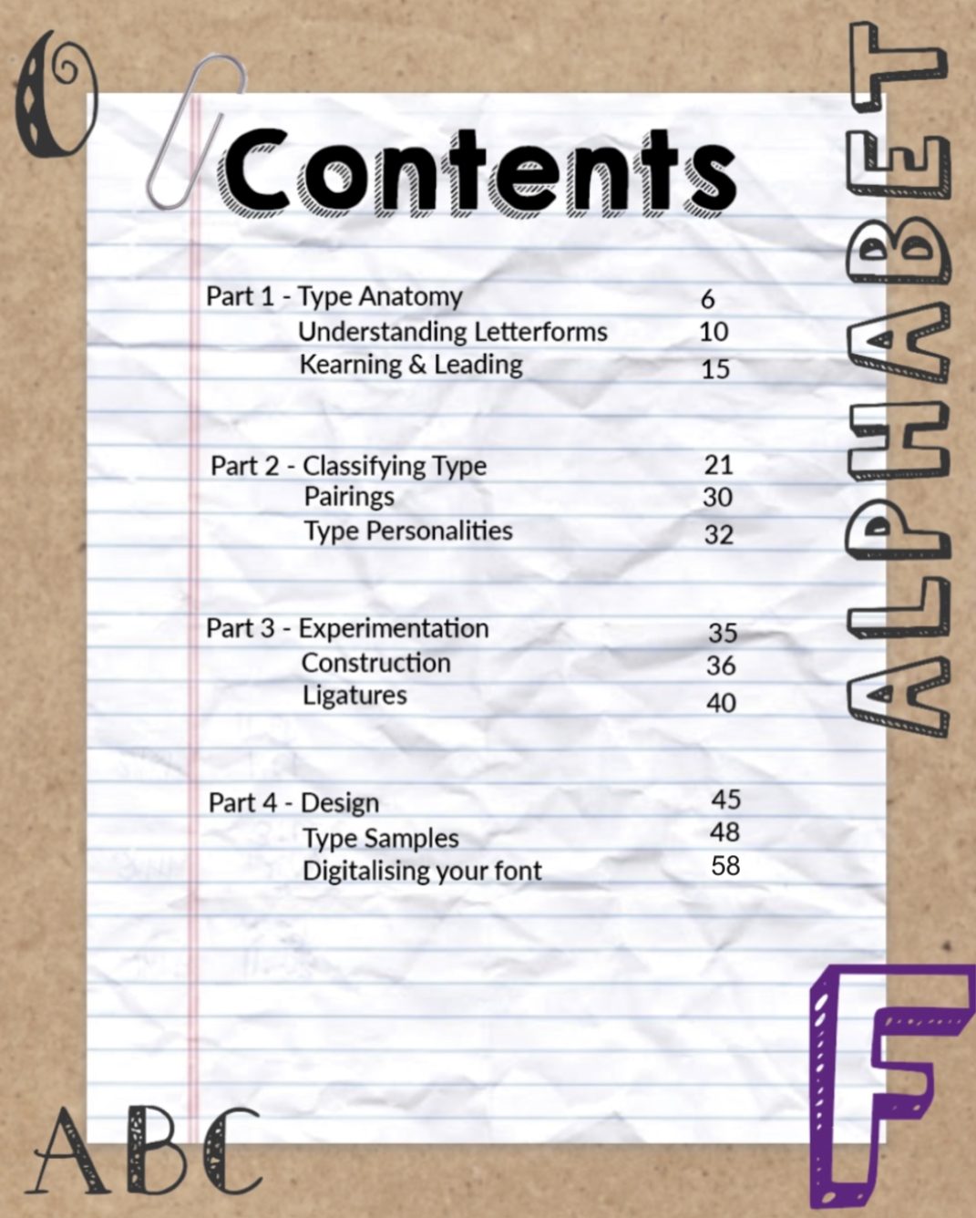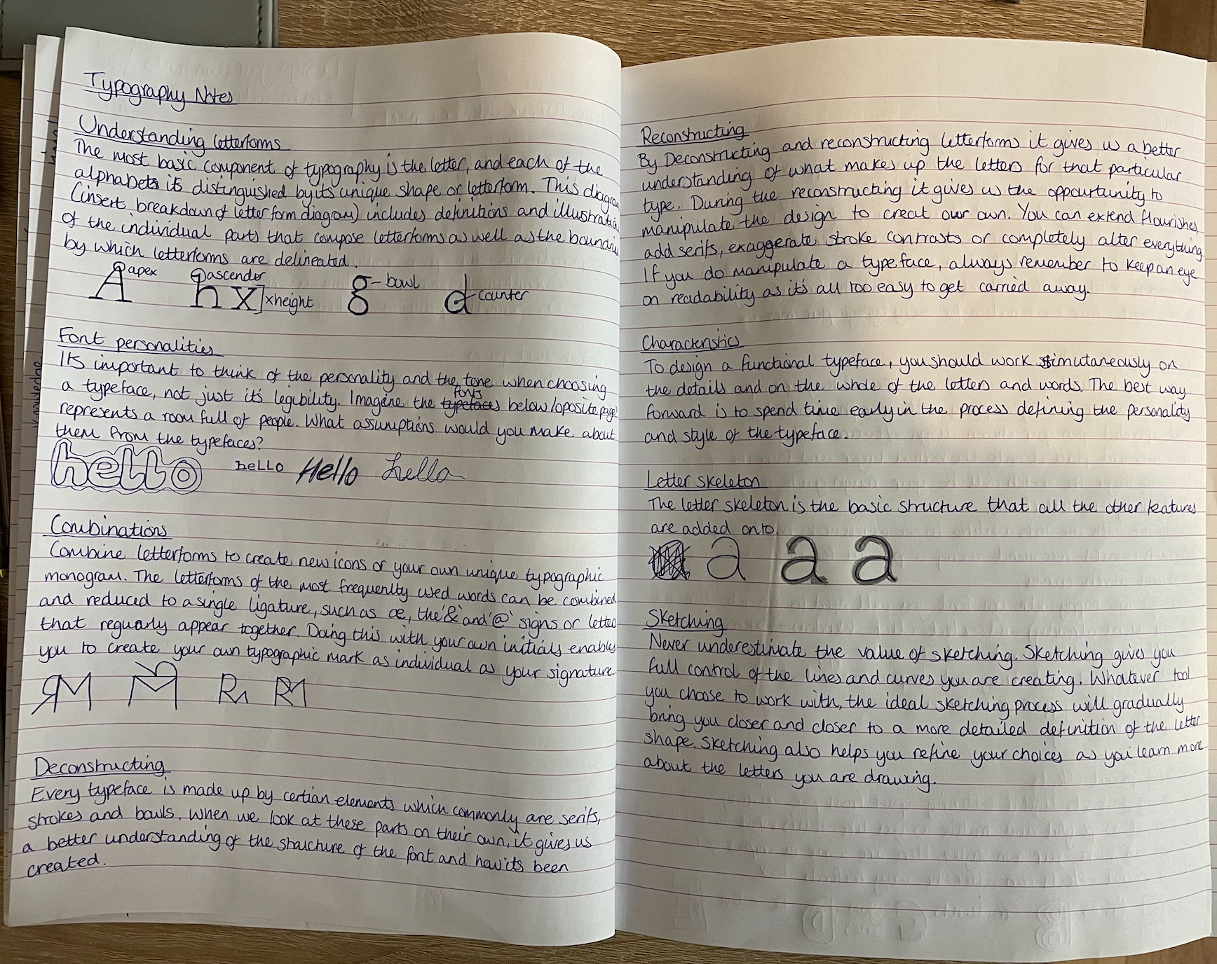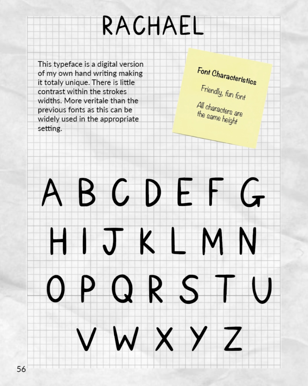 - Type Sample – a selection of my typefaces created, with font details, what it could be used for and what other typefaces it would pair well with.