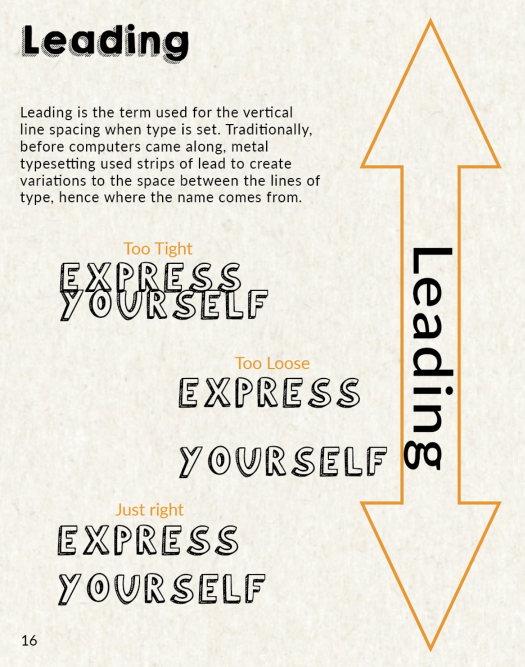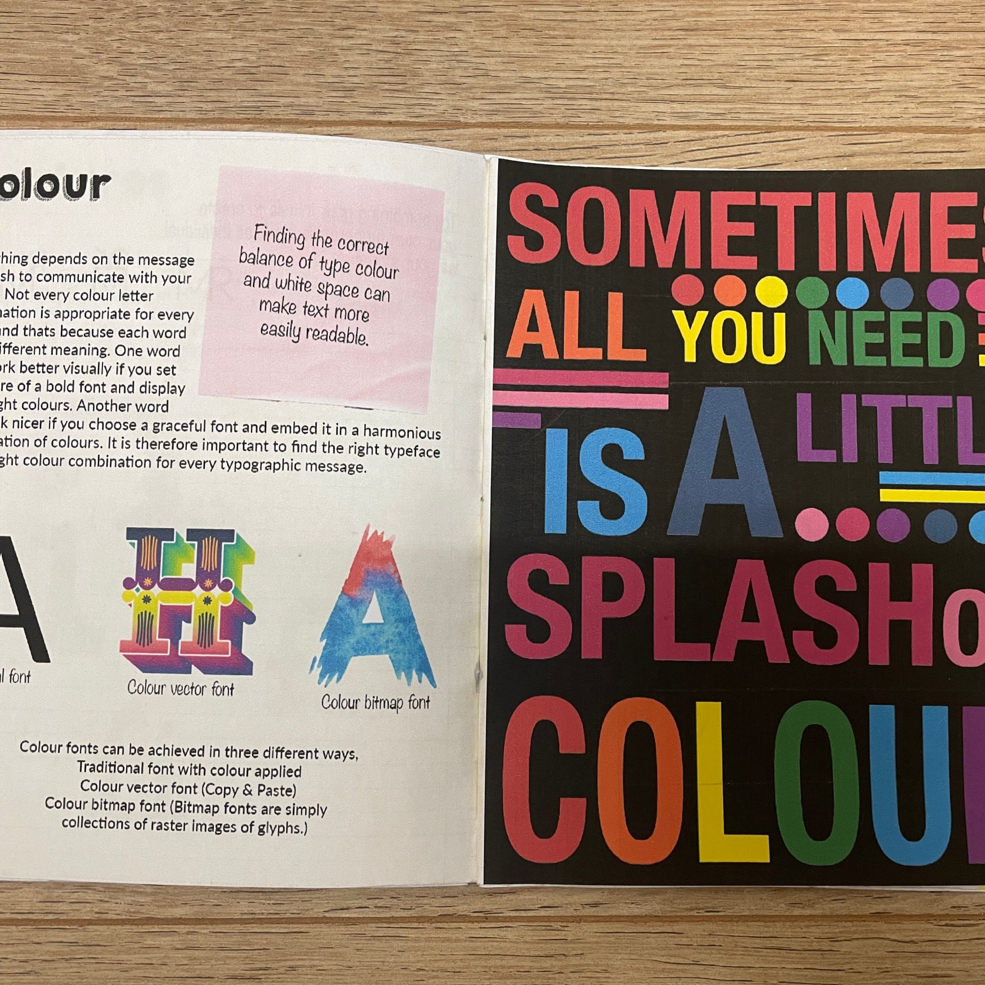 - Typography: Extend you exploration of typography by continuing to develop creative approaches to how typography, layout and your material choices can help generate meaning. Develop a book that explores one aspect of typography in more detail, or combines a variety of approaches. Just because your project explores typography it doesn’t mean you can’t also include images, colour or narrative.