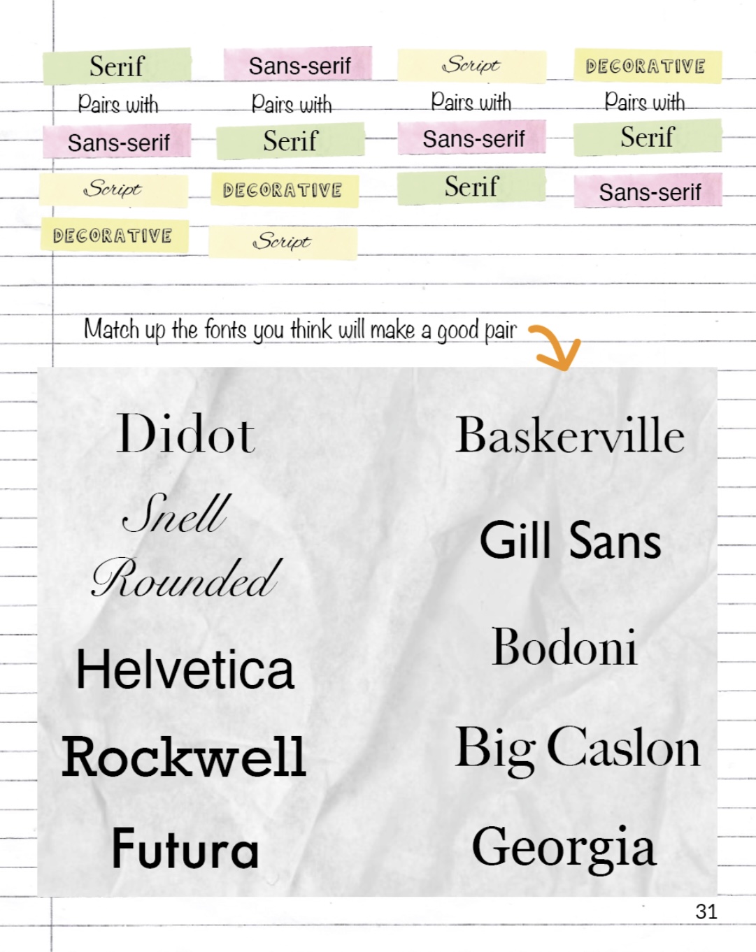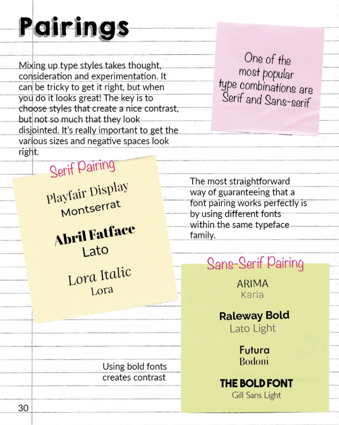 Font parings – When pairing fonts together it is crucial that the correct selection is made, you want your pairings to work and complement one another not to sit together fighting for attention. One important word comes to mind when pairing and that is Contrast, as the name implies, it is about finding totally different – but still complementary – typefaces that are each fit for their intended application. Traditionally, this involves pairing a serif with a sans serif. Serif fonts pair well with Sans serif, Script an Display. Sans-serif fonts pair well with Serif, Script and Slab Serif. Script/Display fonts pairs well with Serif and Sans-serif.