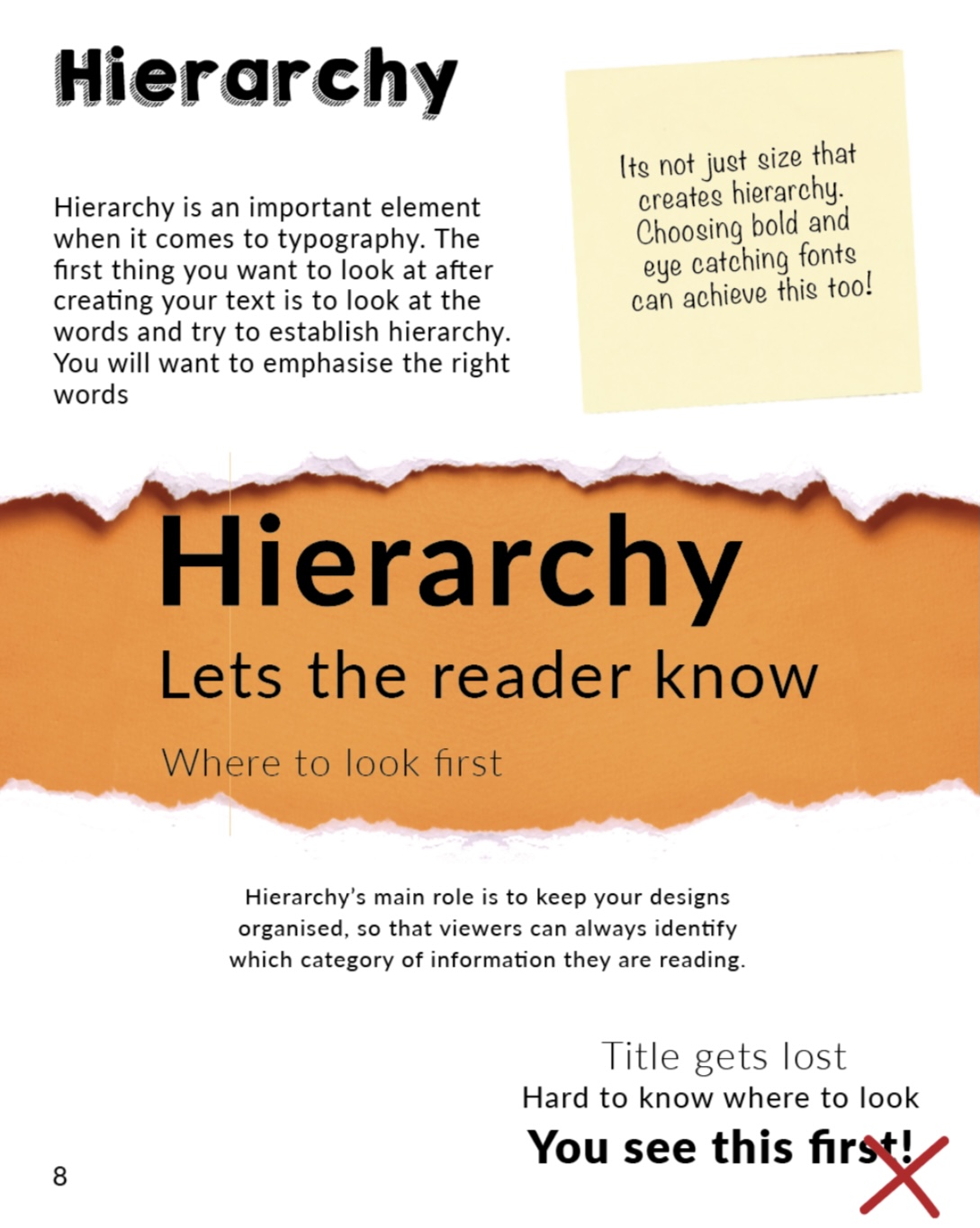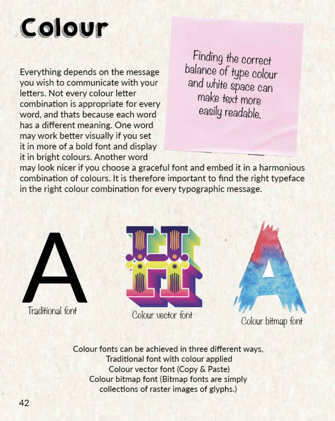 - Type & Colour – Show the pros and cons to working with colour, explain how bad colour choices effect readability and how some font and colours harmonise together