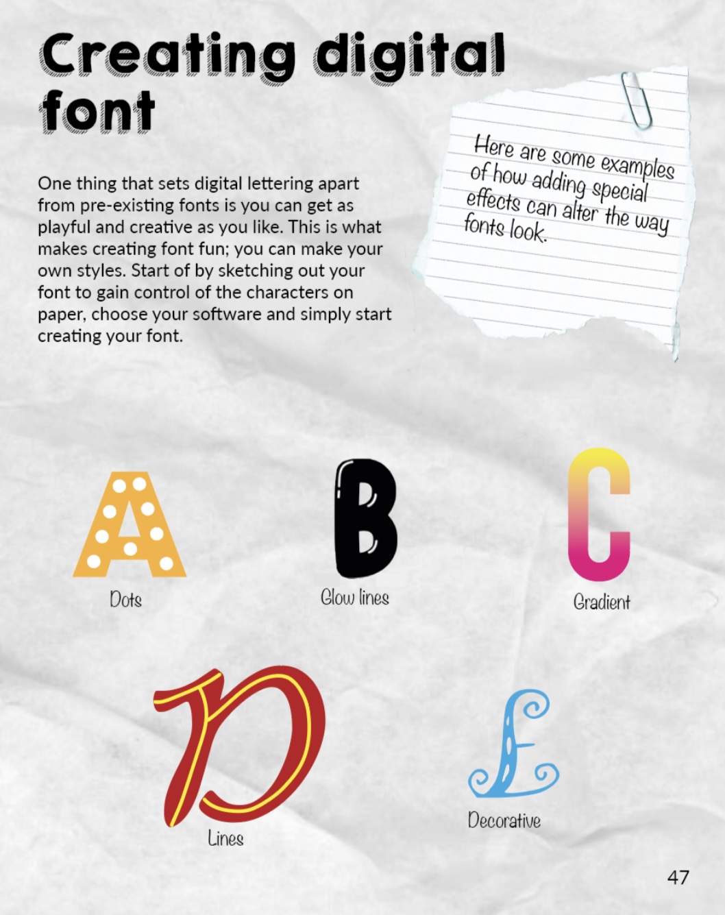 To gain a better understanding of what I am asking my readers to do I myself would like to create some typefaces to use as examples within my book as samples. I would like to go more in depth of creating a typeface. I created my own typeface as part of Assignment 4 in Core Concepts and really enjoyed doing so, so I am looking forward to learning more about this process.