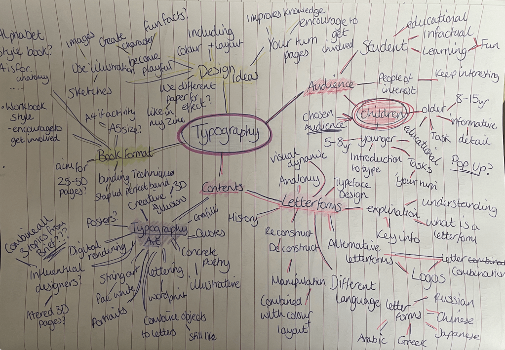 Now that I have decided to choose Typography as my books topic I started to think about the type of book I’d like to produce as this could help influence me into what the contents would contain. As mind maps are the quickest way for me to note down Ideas I have created a larger scale mind map to brainstorm ideas to the contents and which direction I would like to take my book in.