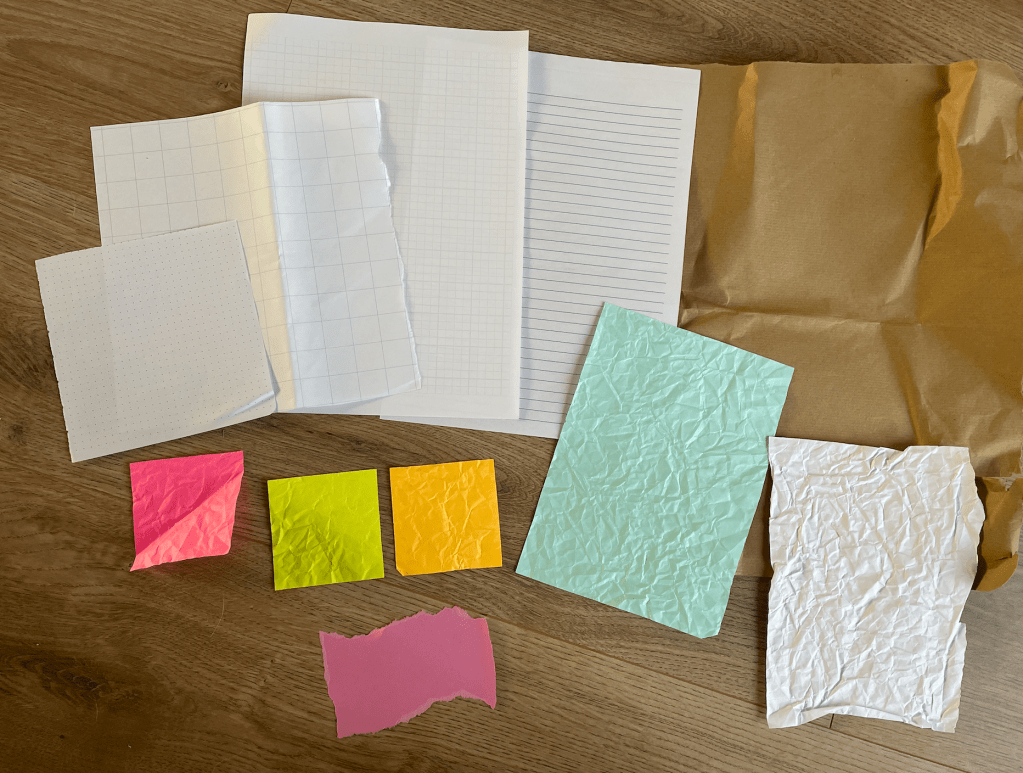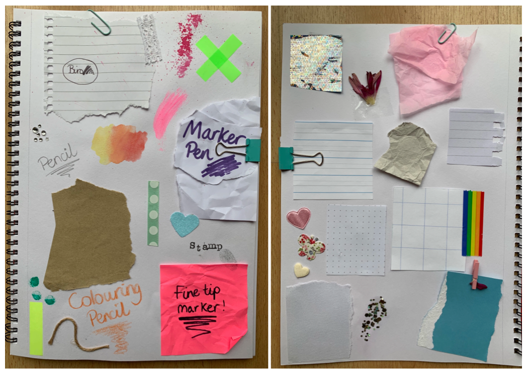Materials – As mentioned previously I’d like to scan in my own elements to scatter throughout my book to give it a ‘doodled’ notebook feel as after all the purpose of my book is an encouraging interactive DIY book. I have gathered some different paper samples to include in my book, these range from textured paper for effect and graph/lined paper for interaction.