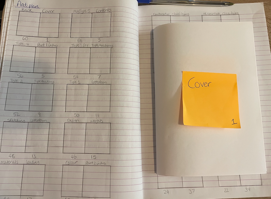Book format – I plan to create an interactive and informal book on typography focusing mainly on encouraging the reader to create a typeface. My book will be aimed at beginners who have an interest in the topic or are starting their journey into the designing world. My book will be 8 x 10 inches (254 x 203mm) which is the standard workbook size, enabling enough space for readers to add their own sketches etc. It lends itself to a 2-column text layout which is an efficient use of space. I will use the Perfect bound technique for my book with the pages equally divided into 3 signatures with the cover overlapping.