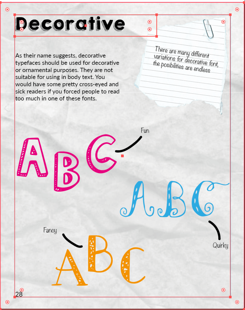 A very brief introduction of the anatomy of a typeface, this would include and informative illustration selecting and highlighting typographic parts and explaining how letterforms work. (I would need to include information on this as it is a book for beginners, however I don’t want to cover too much of what I already have in past assignments, so will keep it short and sweet). Also another insight into classified type showing examples of serif, sans serif, script etc. I think a page with 6-8 boxes showing a single letter of each typeface would work well as there will be no need going into a huge amount of detail.